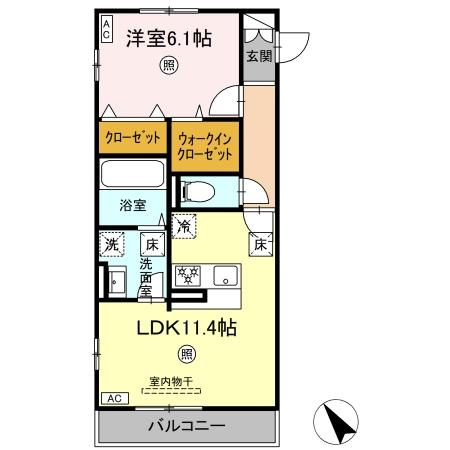 LDK 11.4帖/洋室 6.1帖 - 向き